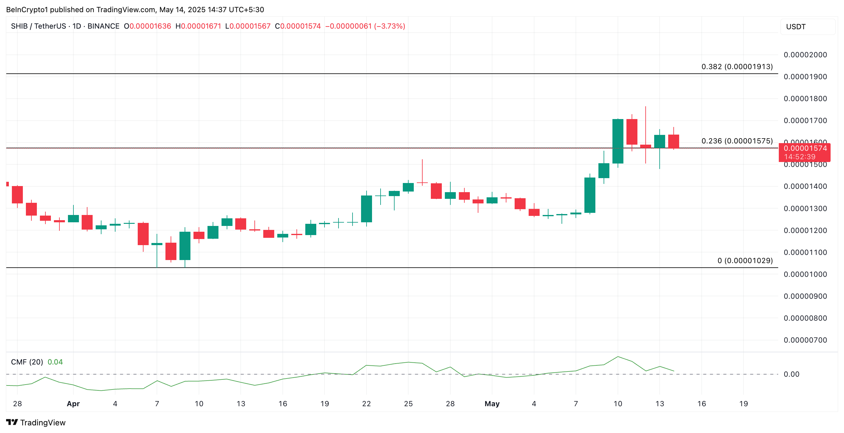 Chaikin Money Flow (CMF) yang menurun pada koin ini menyoroti penurunan tekanan beli di antara trader SHIB. Indikator momentum ini sedang tren menurun dan mencoba menembus di bawah garis nol.
