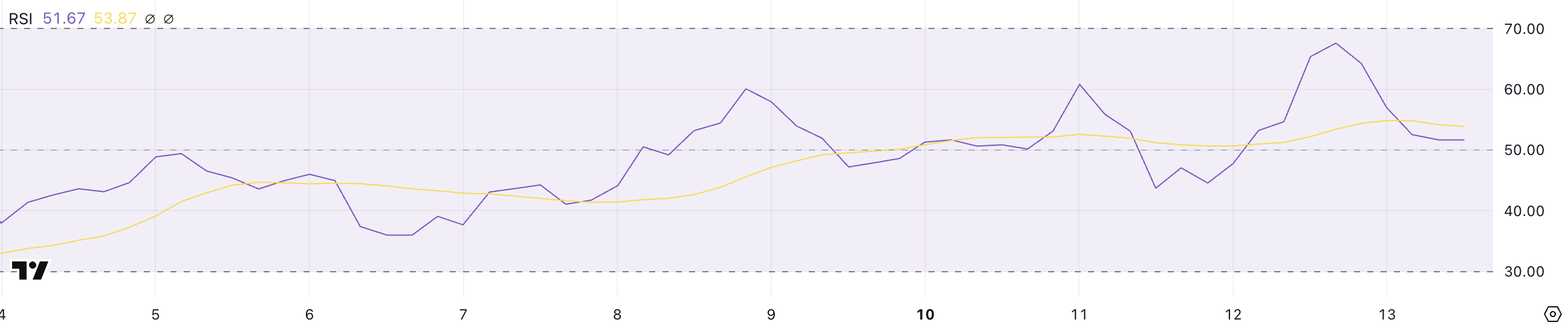 Shiba Inu RSI saat ini berada di 51,6 setelah naik ke 67,6 kemarin. Pergerakan ini menunjukkan bahwa momentum beli meningkat namun gagal mendorong RSI ke zona overbought.