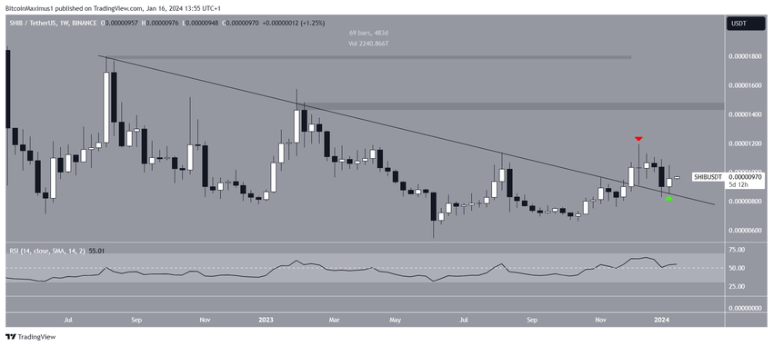 Setelah beberapa kali gagal breakout, SHIB akhirnya berhasil breakout dari garis tren descending resistance pada bulan Desember. Garis tren ini sendiri telah bertahan selama lebih dari 480 hari.