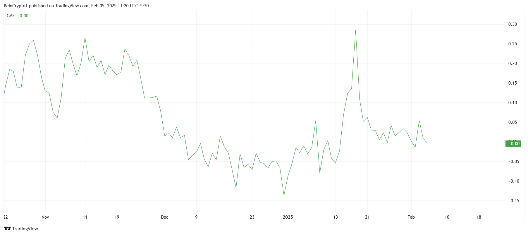 Momentum makro keseluruhan untuk Solana menunjukkan tanda-tanda kelemahan. Chaikin Money Flow (CMF), indikator kunci dari arus masuk dan keluar pasar, kesulitan bertahan di atas garis nol. CMF di bawah nol menandakan bahwa arus keluar mulai mendominasi, yang bisa memperburuk tren penurunan untuk Solana.