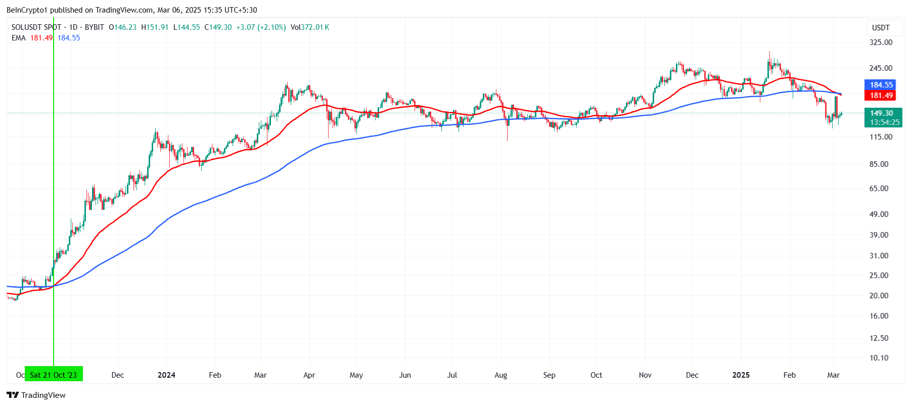 Untuk pertama kalinya sejak Oktober 2023, Solana mengalami Death Cross, mengakhiri tren Golden Cross yang bertahan selama 17 bulan. Fenomena ini terjadi ketika Exponential Moving Average (EMA) 200 hari melintasi EMA 50 hari dari atas ke bawah, yang secara historis menandakan potensi pelemahan lebih lanjut.
