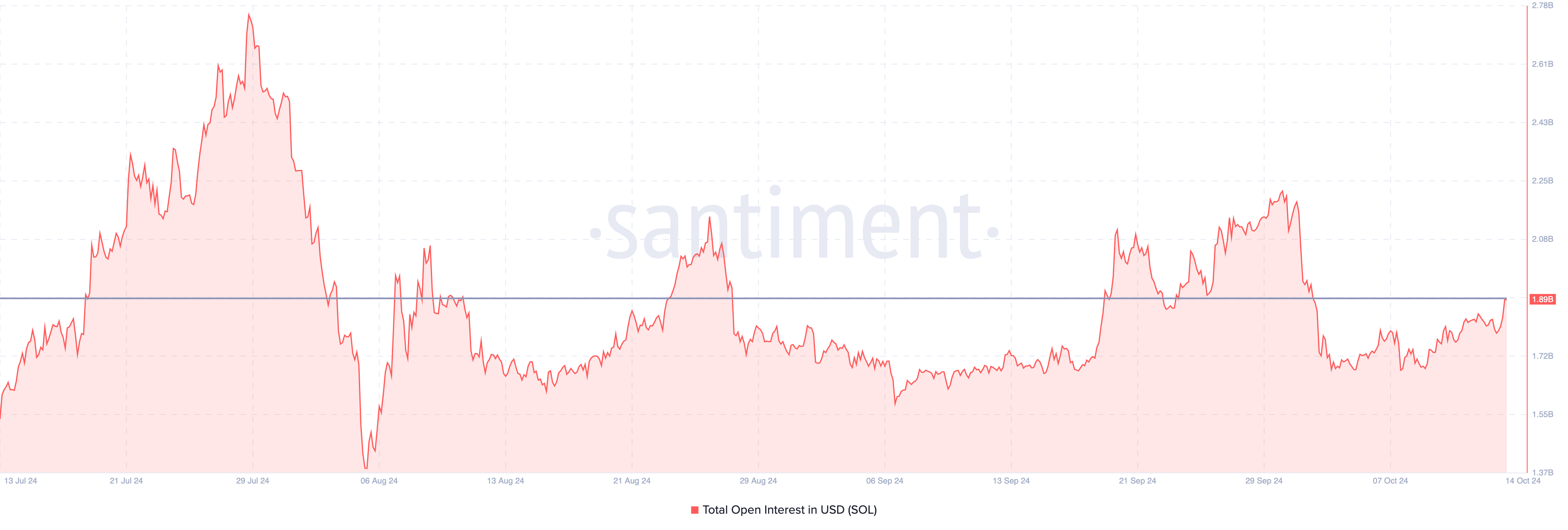 Sejalan dengan pemulihan harga Solana, open interest di pasar derivatif juga mengikuti tren naik, yang mencerminkan pergerakan terbaru dari altcoin tersebut. Open interest (OI) yang merupakan indikator kunci dalam aktivitas spekulatif, terakhir kali mencapai puncaknya pada US$1,89 miliar di 1 Oktober, bertepatan dengan terjadinya reli awal SOL.