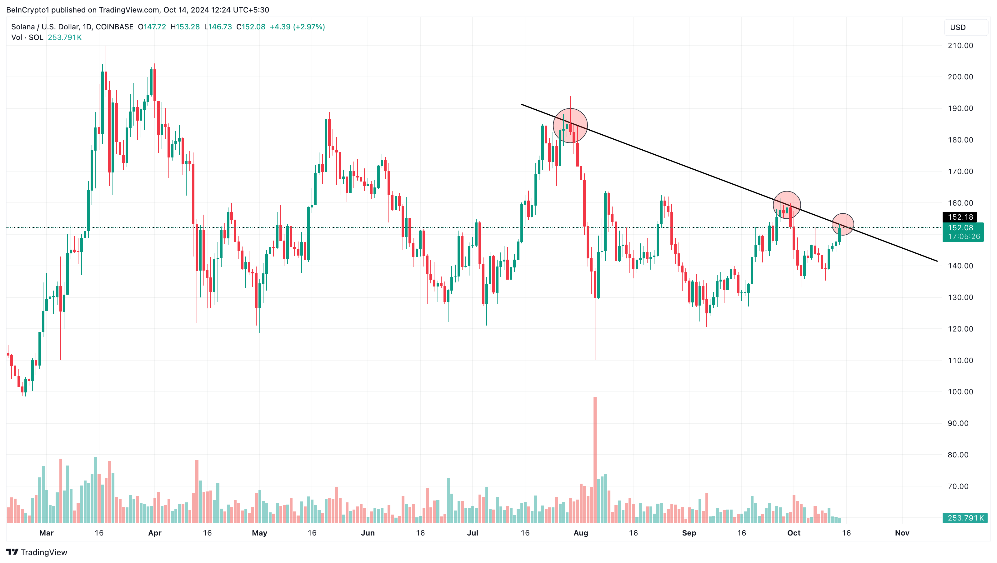 Sekarang, dengan token tersebut telah pulih menjadi US$152,08, Solana sepertinya telah mengatasi kerugian terburuknya. Kenaikan terbaru ini meningkatkan harapan untuk lepas dari garis tren menurun yang telah membatasi SOL sejak akhir Juli.