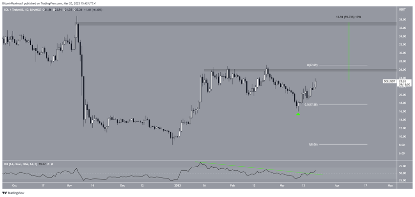 SOL adalah native crypto dari blockchain Solana, yang diciptakan oleh Anatoly Yakovenko. Blockchain ini berkonsentrasi pada smart contract dan aplikasi terdesentralisasi (dApp). Harga Solana sendiri telah meningkat sejak itu, sehingga menciptakan pola candlestick bullish hammer pada 10 Maret (ikon hijau). Kenaikan harga ini juga menyebabkan SOL berhasil merebut kembali level retracement support 0,5 Fib di US$17,60. Aksi semacam itu dianggap sebagai perkembangan yang bullish dan seringkali diikuti oleh pergerakan naik yang signifikan.