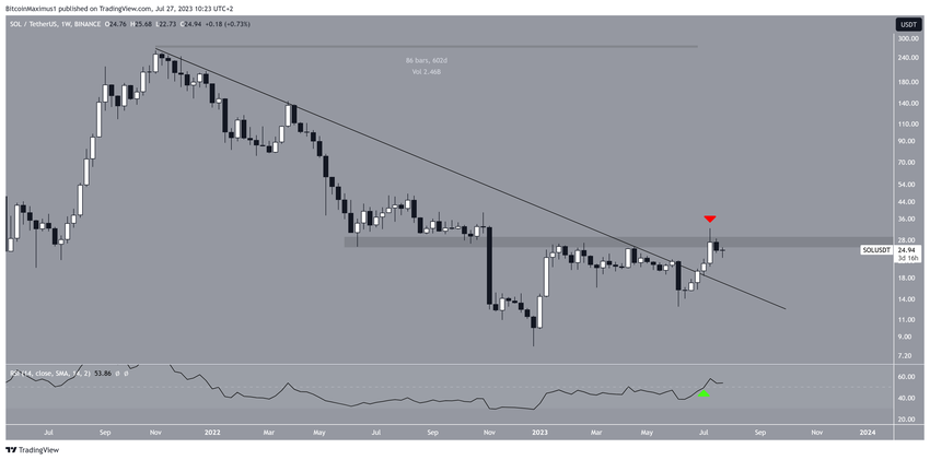 Jika mengamati time frame mingguan SOL, terungkap peristiwa penting yang terjadi tiga minggu lalu. Pada saat itu, SOL berhasil menembus garis resistance menurun yang telah berlangsung sejak November 2021, dengan durasi lebih dari 600 hari.