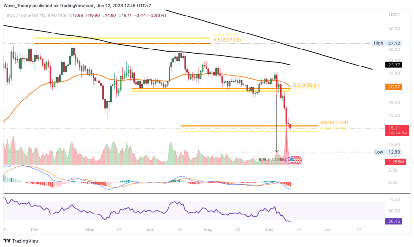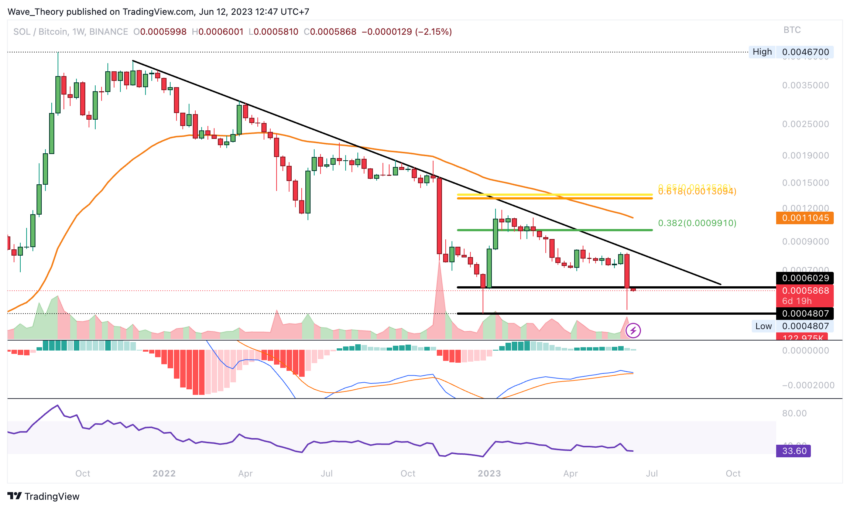 Harga SOL telah menembus level support Golden Ratio di sekitar 0,00075 BTC. Akibatnya, Solana kini telah mencapai level support kritis di antara angka sekitar 0,00048 BTC dan 0,0006 BTC.