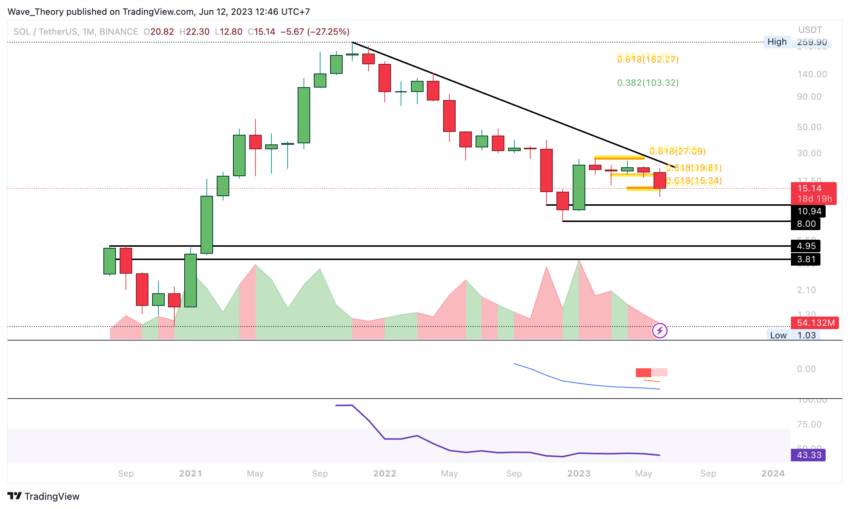 Jika Solana melanjutkan tren bearish dan menembus level support berikutnya, yang berada di antara kisaran level US$8 dan US$11, support penting berikutnya dapat ditemukan di area US$3,84 hingga US$5.