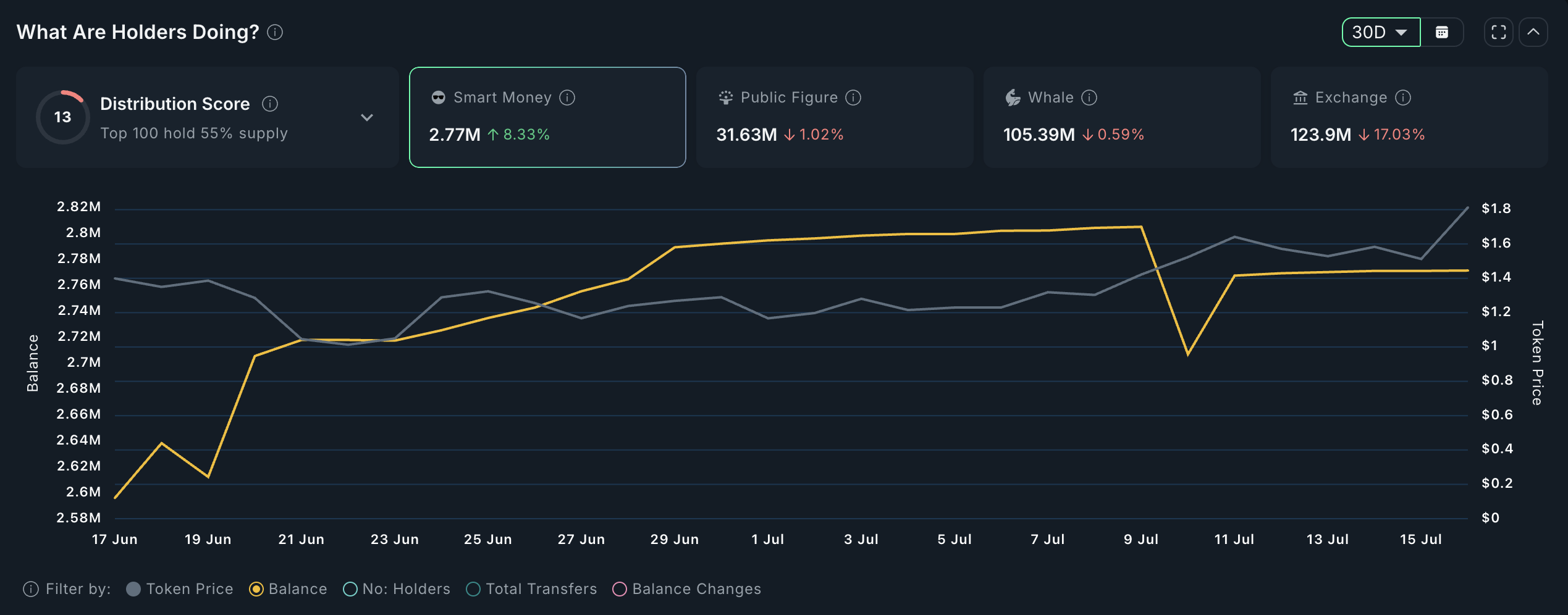 Data on-chain menunjukkan peningkatan kepemilikan smart money dan penurunan arus masuk ke exchange selama 30 hari terakhir, menunjukkan akumulasi mungkin sedang terjadi di bawah permukaan. Dengan konsolidasi yang sedang berlangsung tepat di bawah level tertinggi, para trader mengamati dengan cermat kemungkinan breakout menuju US$2.