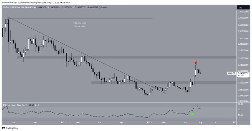 Setelah itu, XLM bergerak di atas resistance US$0,105 dan mencapai puncak tahunan baru sebesar US$0,195 pada Juni. Namun, harganya terus turun sejak itu, sampai menciptakan sumbu atas (upper wick) yang panjang serta beberapa candlestick bearish mingguan.