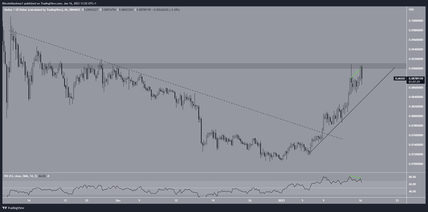 Analisis teknikal dari time frame enam jamnya menunjukkan bahwa harga Stellar Lumens sudah menjebol garis descending resistance pada 10 Januari (garis putus-putus). Alhasil, kondisi ini mampu mempercepat tingkat kenaikan harganya yang terjadi setelah itu, dan sukses mencapai titik tertinggi US$0,090 pada 14 Januari. Titik tertinggi tersebut akhirnya berhasil memvalidasi area resistance US$0,09.