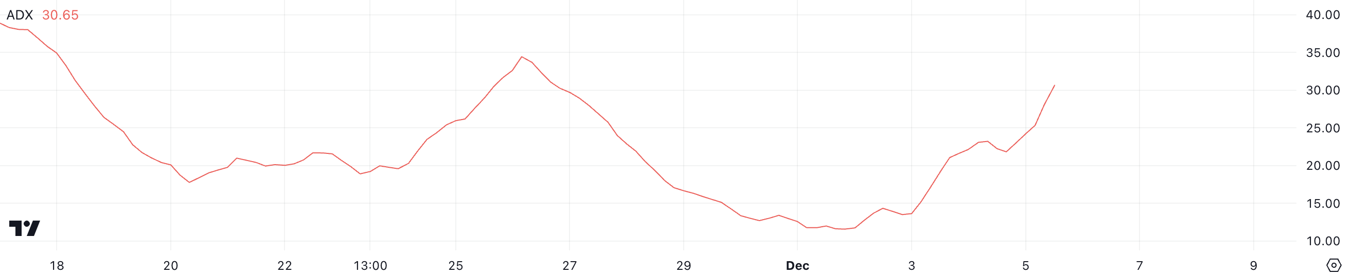 ADX (Average Directional Index) mengukur kekuatan tren, dengan nilai di atas 25 menunjukkan tren kuat dan di bawah 25 menunjukkan pasar yang lemah atau konsolidasi. ADX SUI di 30,6 mengonfirmasi bahwa ia berada dalam tren naik, dengan ruang pertumbuhan lebih lanjut sebelum tren menunjukkan tanda-tanda memudar.