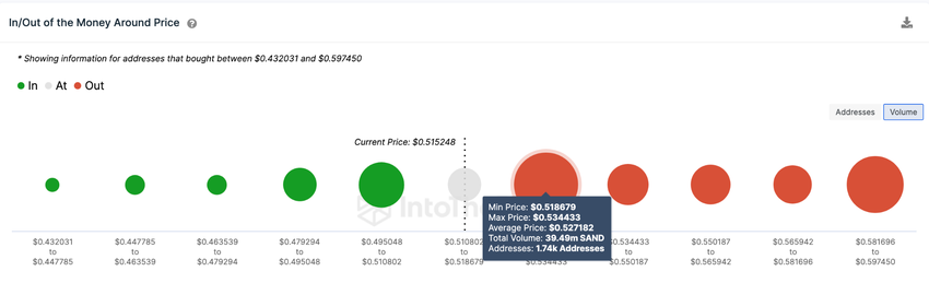 Menurut data In/Out of the Money (IOMAP) dari IntoTheBlock, SAND harus berhasil breakout di atas US$0,53 agar pihak bull bisa mengambil alih kendali yang kuat. Namun, 1.740 investor yang membeli 39,5 juta token SAND dengan harga rata-rata US$0,53 dapat memperlambat reli harga tersebut.