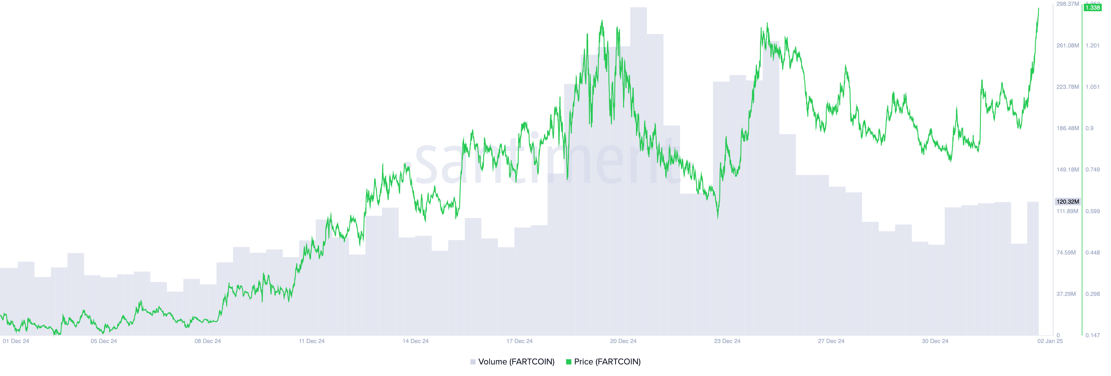FARTCOIN melonjak 27% dalam 24 jam terakhir, mencapai rekor tertinggi baru US$1,36. Namun, reli ini mendorong peningkatan pengambilan keuntungan, karena investor memanfaatkan keuntungan terbaru.