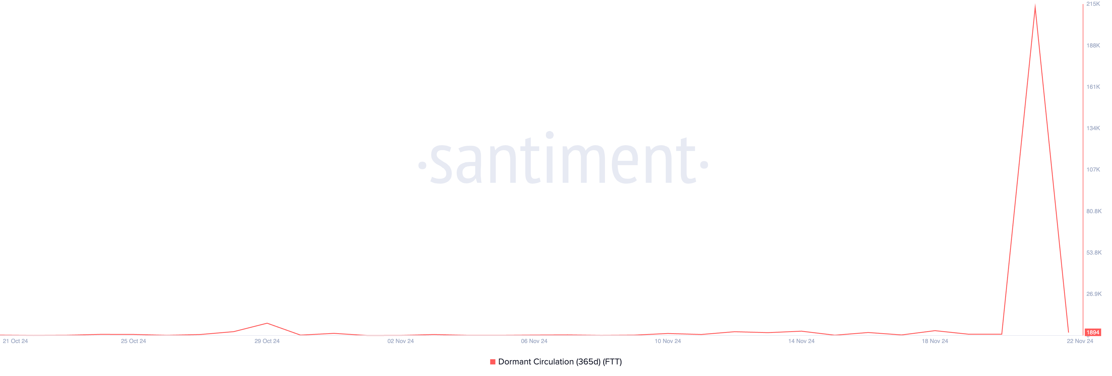 Pengumuman ini memicu lonjakan aktivitas perdagangan FTT,. Token yang selama ini tidak aktif, kini mulai berpindah tangan. Analisis BeInCrypto terhadap kinerja on-chain altcoin ini mengungkapkan peningkatan dalam dormant circulation FTT. Setelah siaran pers FTX pada hari Kamis, metrik ini—yang mengukur jumlah koin atau token unik yang ditransaksikan setelah tidak bergerak selama setidaknya 365 hari—naik ke level tertinggi 30 hari di 213.350.