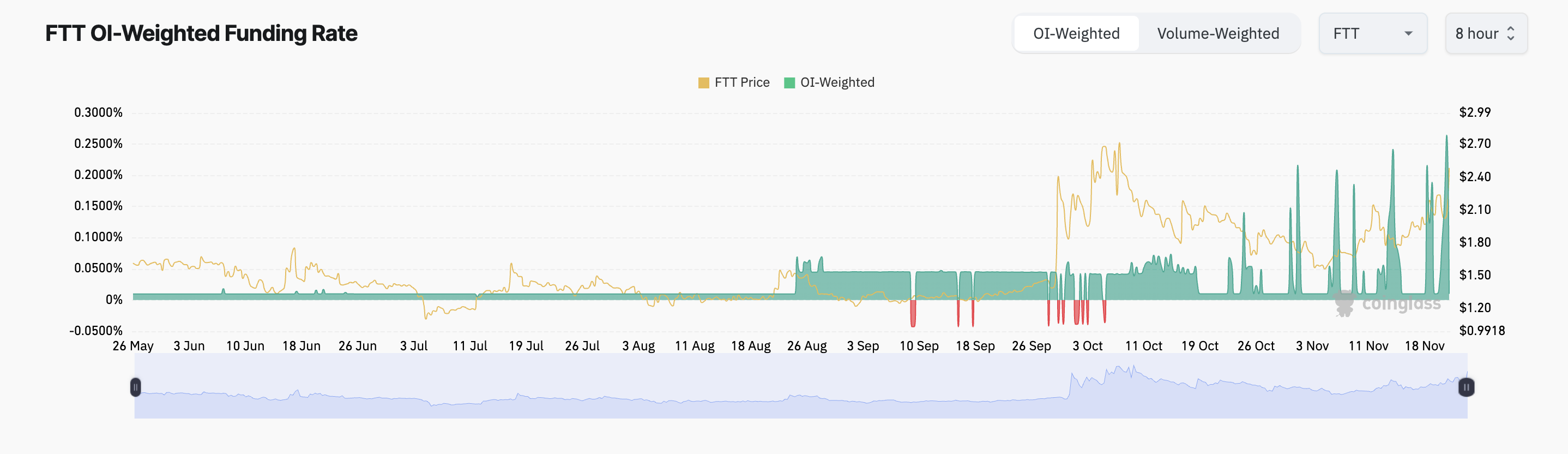 Funding rate adalah pembayaran berkala yang dipertukarkan antara posisi long dan short dalam kontrak futures perpetual untuk memastikan harga mereka selaras dengan pasar spot. Ketika nilainya positif, posisi long membayar short, menunjukkan sentimen pasar yang bullish. Oleh karena itu, di pasar futures FTT, lebih banyak trader bertaruh pada reli harga yang berkelanjutan ketimbang mengantisipasi penurunan harga.