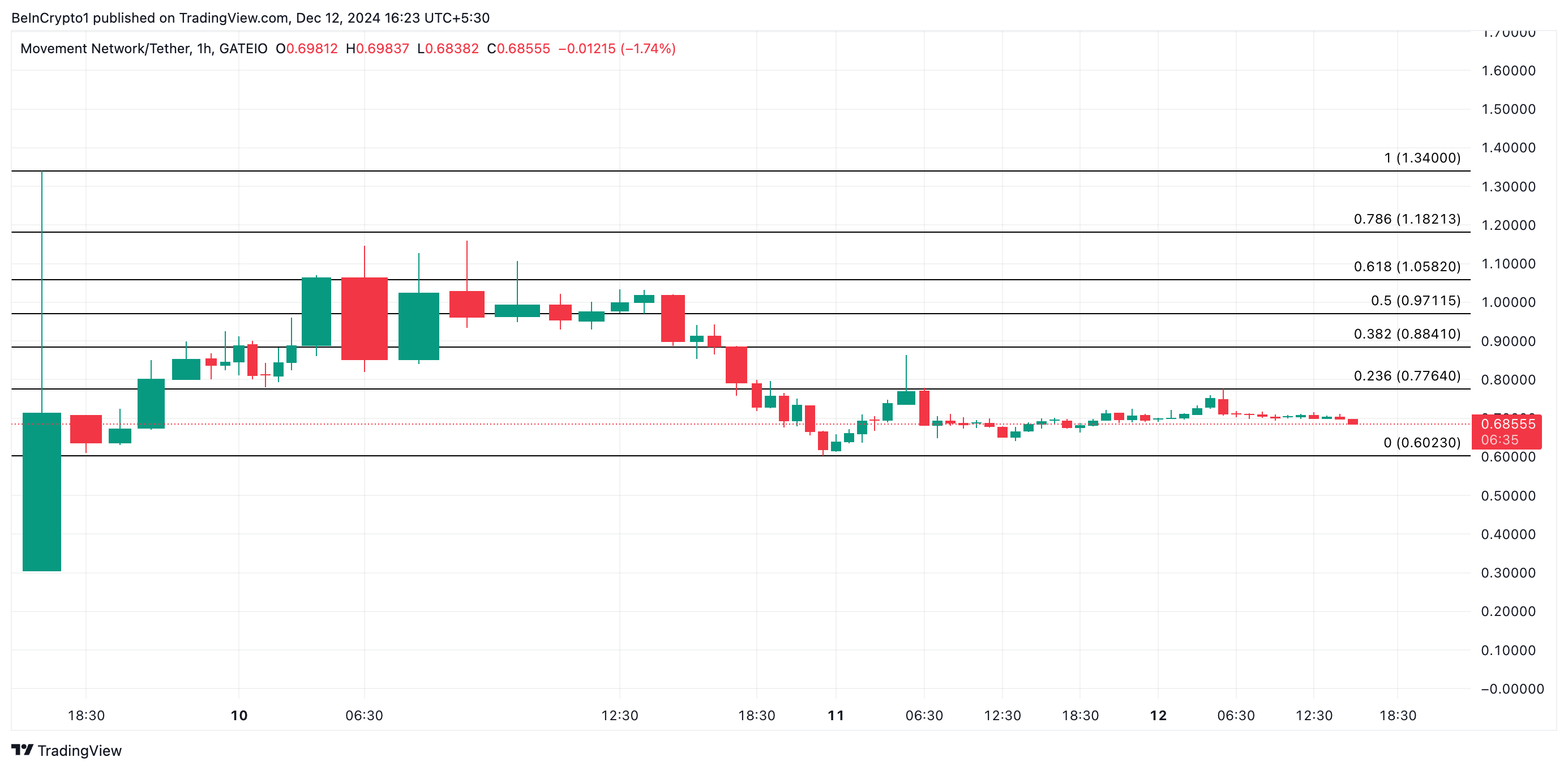 Pada grafik 1 jam, token layer-2 diperdagangkan pada US$0,68, melayang di atas support yang terbentuk di US$0,60. Jika tekanan bearish menguat, harga altcoin ini mungkin menguji level support ini. Jika gagal bertahan, tren turun dapat berlanjut.
