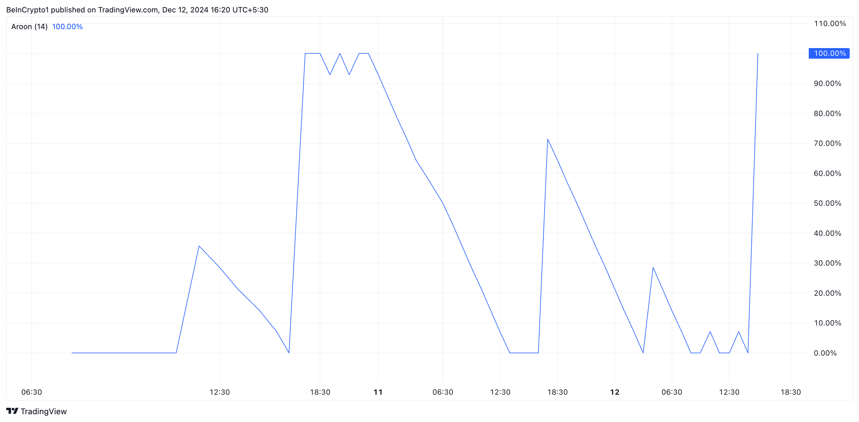 Ketika garis Aroon Down mencapai 100%, harga terendah selama periode yang dipilih terjadi baru-baru ini, menandakan tren turun yang kuat. Ini menunjukkan bahwa pasar berada dalam fase bearish dengan sedikit momentum naik.