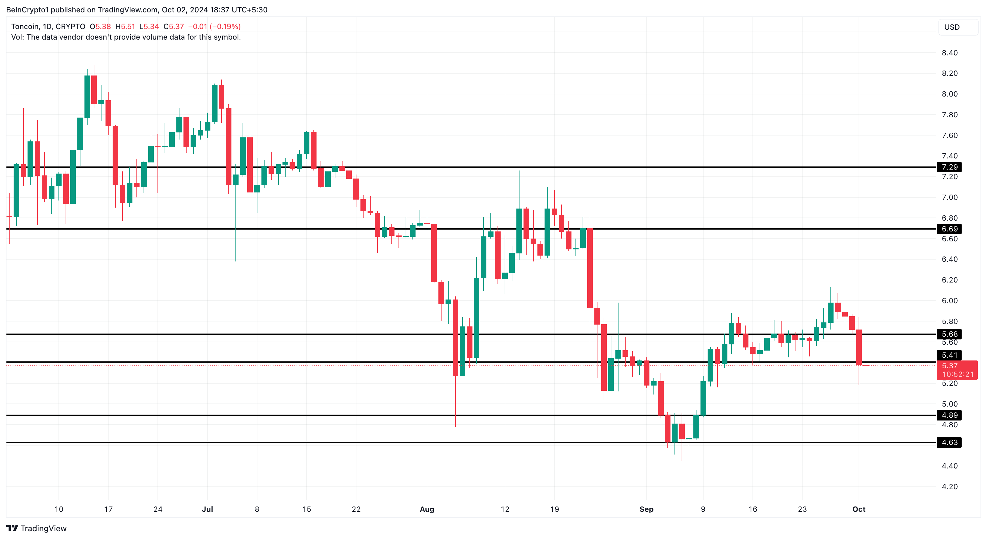 Pada tanggal 28 September, harga Toncoin (TON) kembali mencoba US$6 untuk pertama kalinya dalam lebih dari sebulan. Namun, altcoin ini tidak dapat bertahan lama di ambang batas tersebut karena harga turun menjadi US$5,40