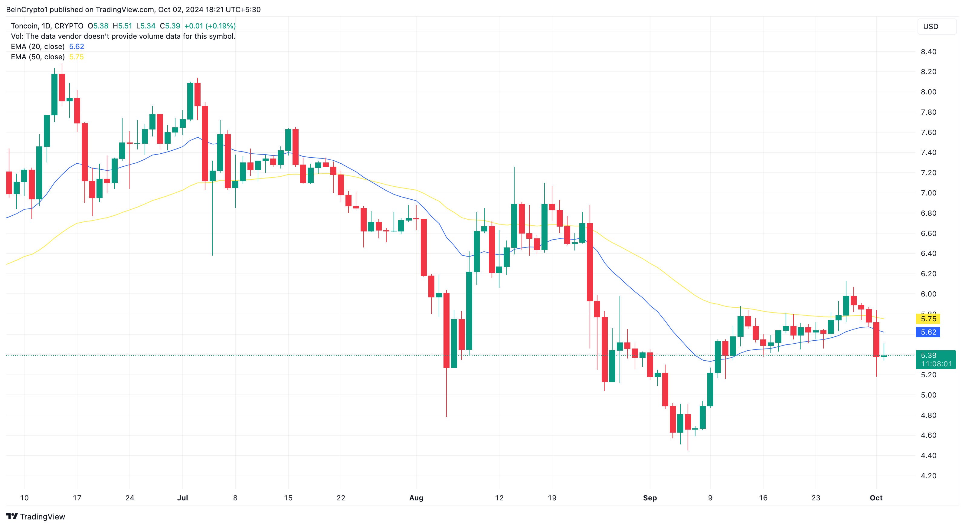 Ketika EMA berada di atas harga, trennya bearish. Sebaliknya, jika harga di atas EMA, trennya bullish. Dengan harga TON di US$5,40, gambar di bawah ini menunjukkan bahwa EMA 20 (biru) dan EMA 50 (kuning) berada di atas harga koin asli Telegram tersebut.