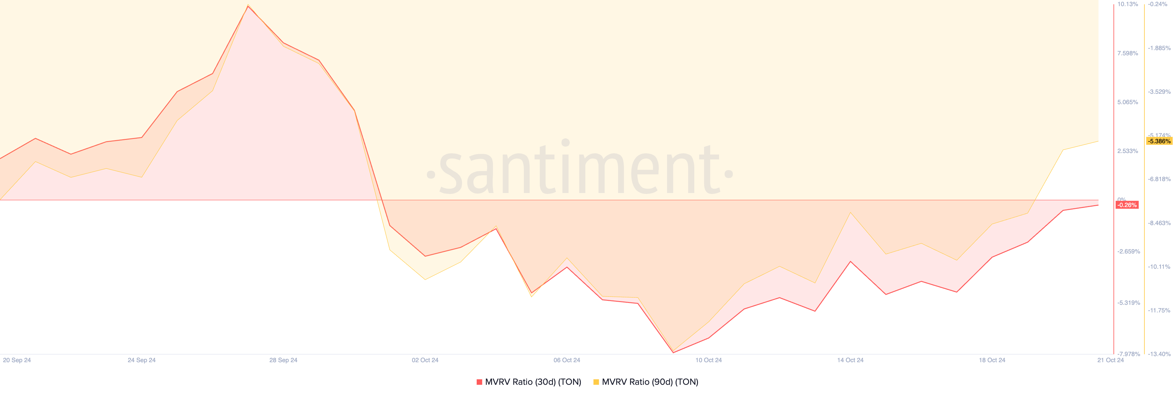 Rasio Market Value to Realized Value (MVRV) Toncoin, yang mengukur profitabilitas keseluruhan semua holder-nya, menunjukkan bahwa altcoin ini telah mengalami undervalued dalam beberapa minggu terakhir. Saat ini, rasio MVRV 30 hari dan 90 hari token tersebut masing-masing adalah -0,26% dan -5,38%.