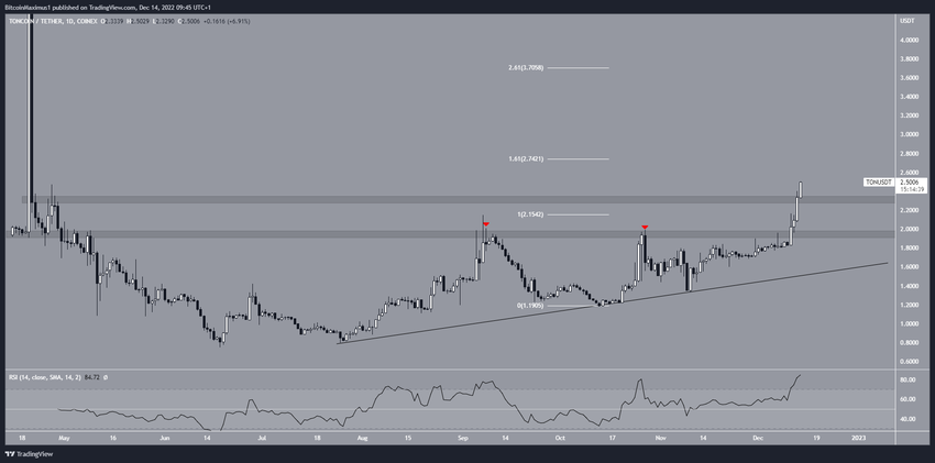SponsoredSaat 14 Desember, Toncoin terpantau menembus area resistance US$2,30, yang merupakan resistance horizontal terakhir sebelum mencapai level ATH baru. Breakout tersebut diiringi pula dengan pergerakan indikator RSI di atas 70 (simbol hijau).