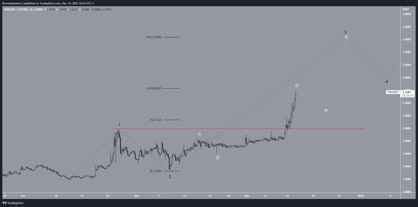 Penurunan di bawah titik tertinggi gelombang satu, yakni US$1,99 (garis merah), akan membatalkan prediksi bullish harga Toncoin.