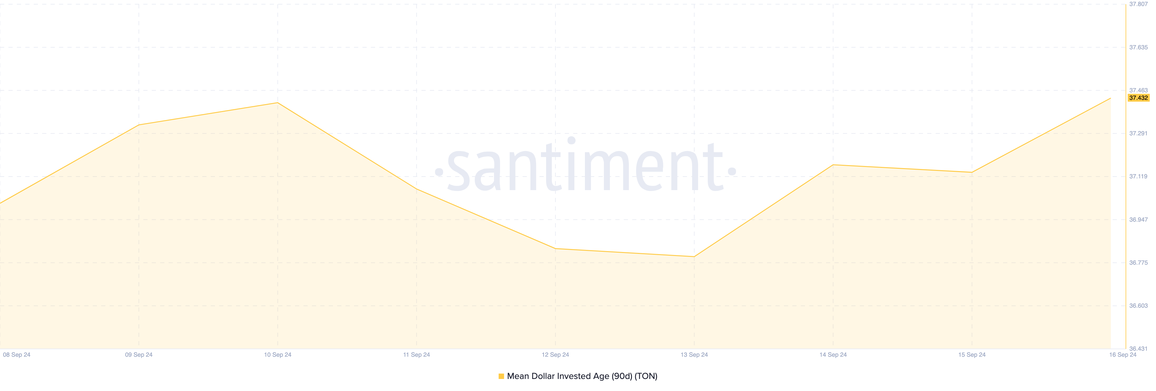 Saat ini, harga Toncoin adalah US$5,55, turun 32% dari puncaknya di bulan Juni. Namun, data on-chain dari Santiment menunjukkan peningkatan yang mencolok dalam Mean Dollar Invested Age (MDIA), metrik yang dihitung berdasarkan waktu yang melacak usia rata-rata setiap dolar yang diinvestasikan dalam sebuah koin.