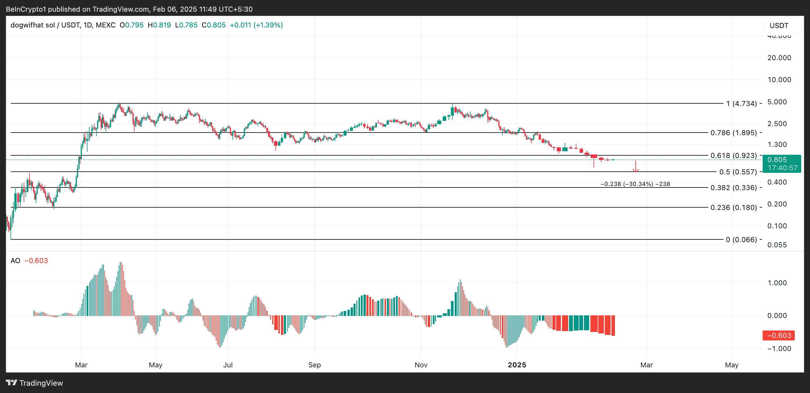 Pembacaan dari Awesome Oscillator (AO) WIF mengonfirmasi melemahnya permintaan untuk altcoin ini. Indikator ini menunjukkan batang histogram merah yang menghadap ke bawah saat ini, mencerminkan tekanan jual yang tinggi. Nilainya adalah -0,60.