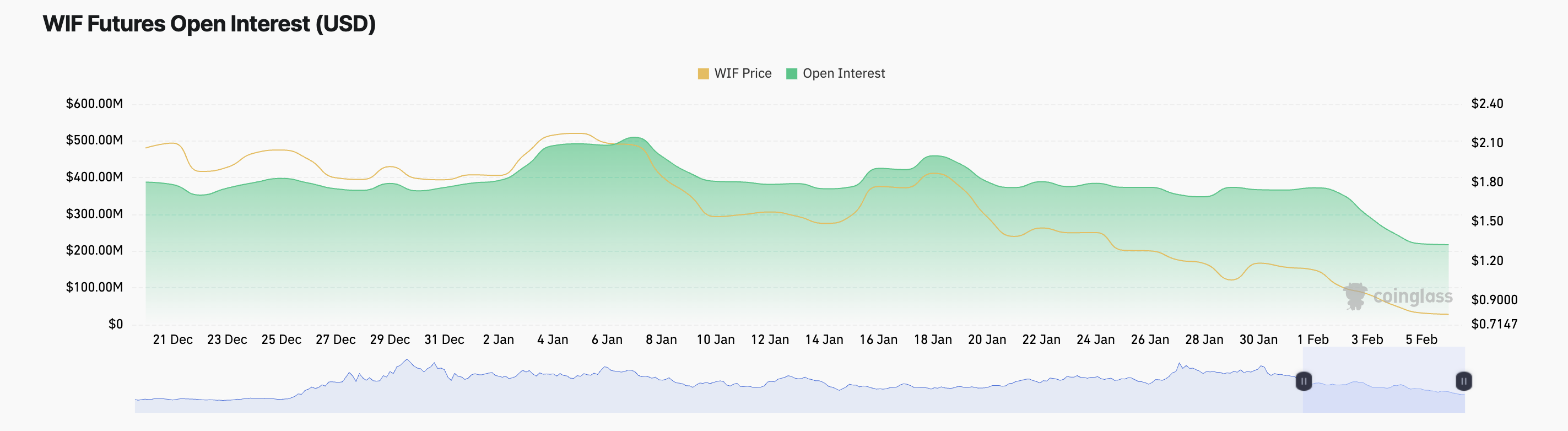 Disamping itu, open interest WIF memperkuat pandangan bearish ini. Open interest telah menurun secara bertahap sejak awal Februari, turun 42%.