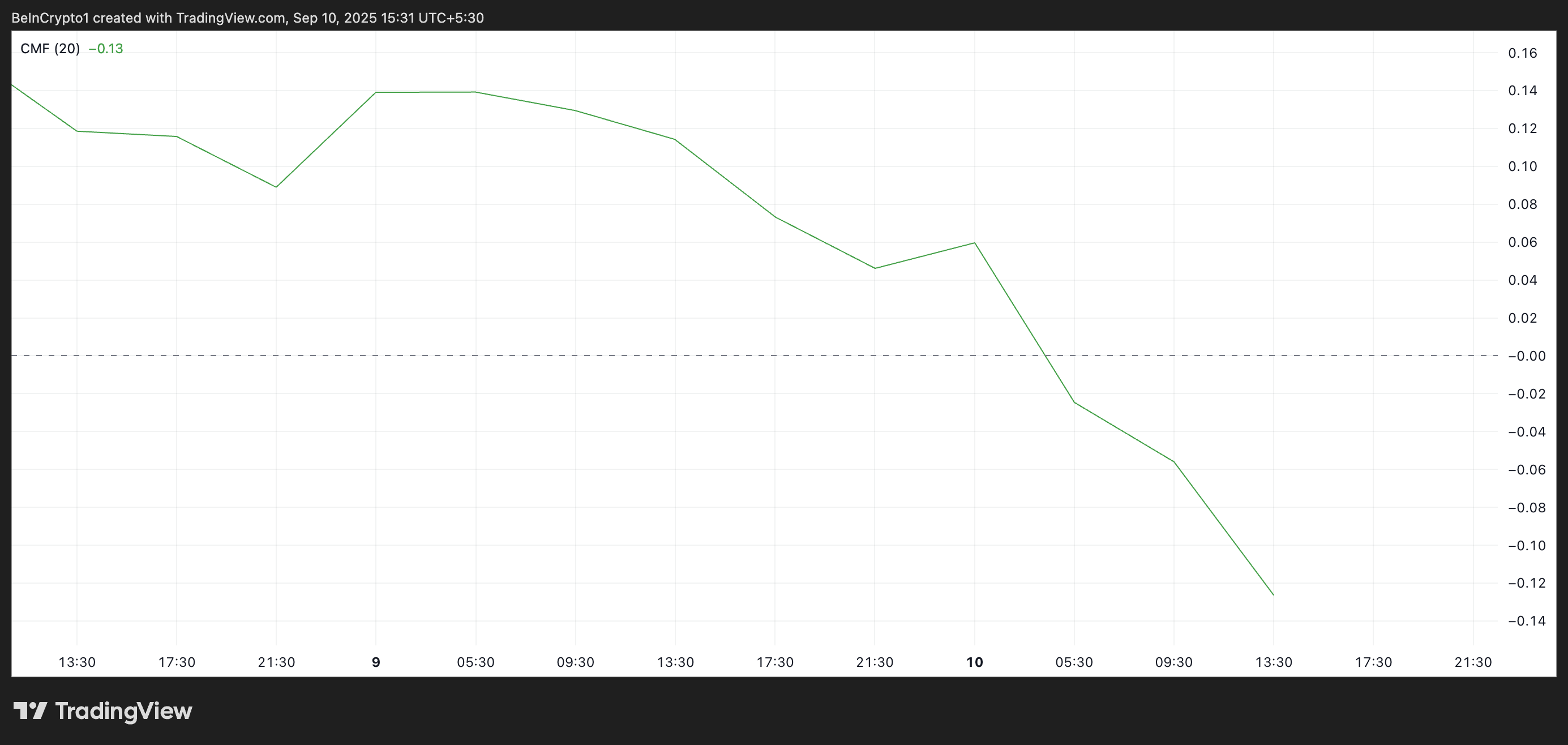 Indikator CMF mengukur tekanan beli dan jual dengan menggabungkan data harga dan volume. Bacaan CMF positif menandakan aktivitas beli yang kuat dan akumulasi, sementara nilai negatif menunjukkan tekanan jual dan distribusi.