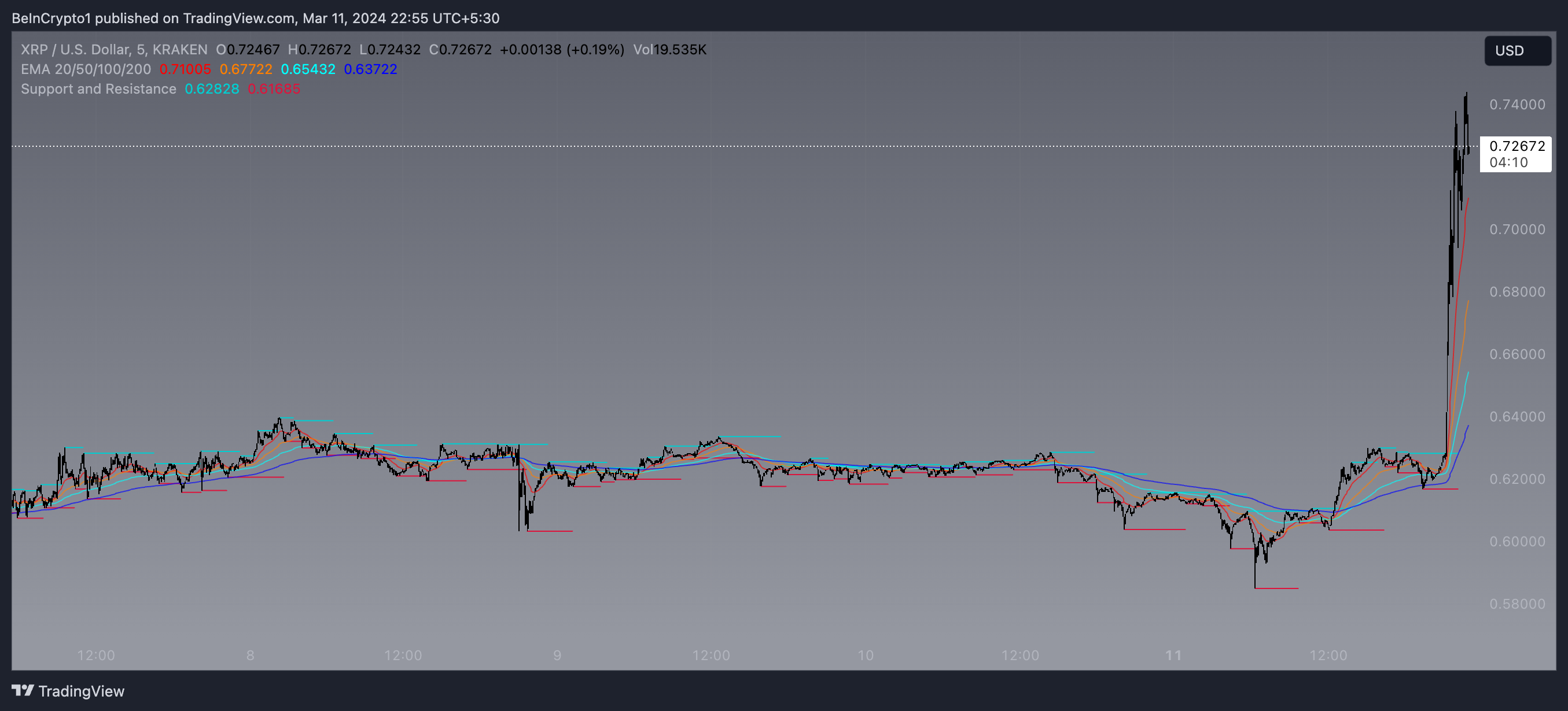 Di samping itu, analisis ini juga menyoroti level support dan resistance. Level support di US$0,62 mewakili level harga di mana aset ini sebelumnya telah menemukan minat beli yang signifikan. Sementara itu, level resistance di US$0,72 mewakili titik harga di mana tekanan jual sebelumnya cukup kokoh untuk mencegah harga naik.