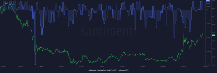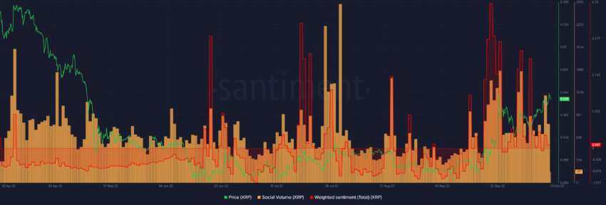 Pada hari Minggu (9/10), harga XRP meningkat 3,8% dan menyentuh titik tertinggi harian di level US$0,540. Performa harga tersebut dibarengi pula dengan peningkatan dari sisi volume sosial. Saat artikel ini ditulis, XRP diperdagangkan seharga US$0,534; naik 4,23% dalam rentang waktu harian.