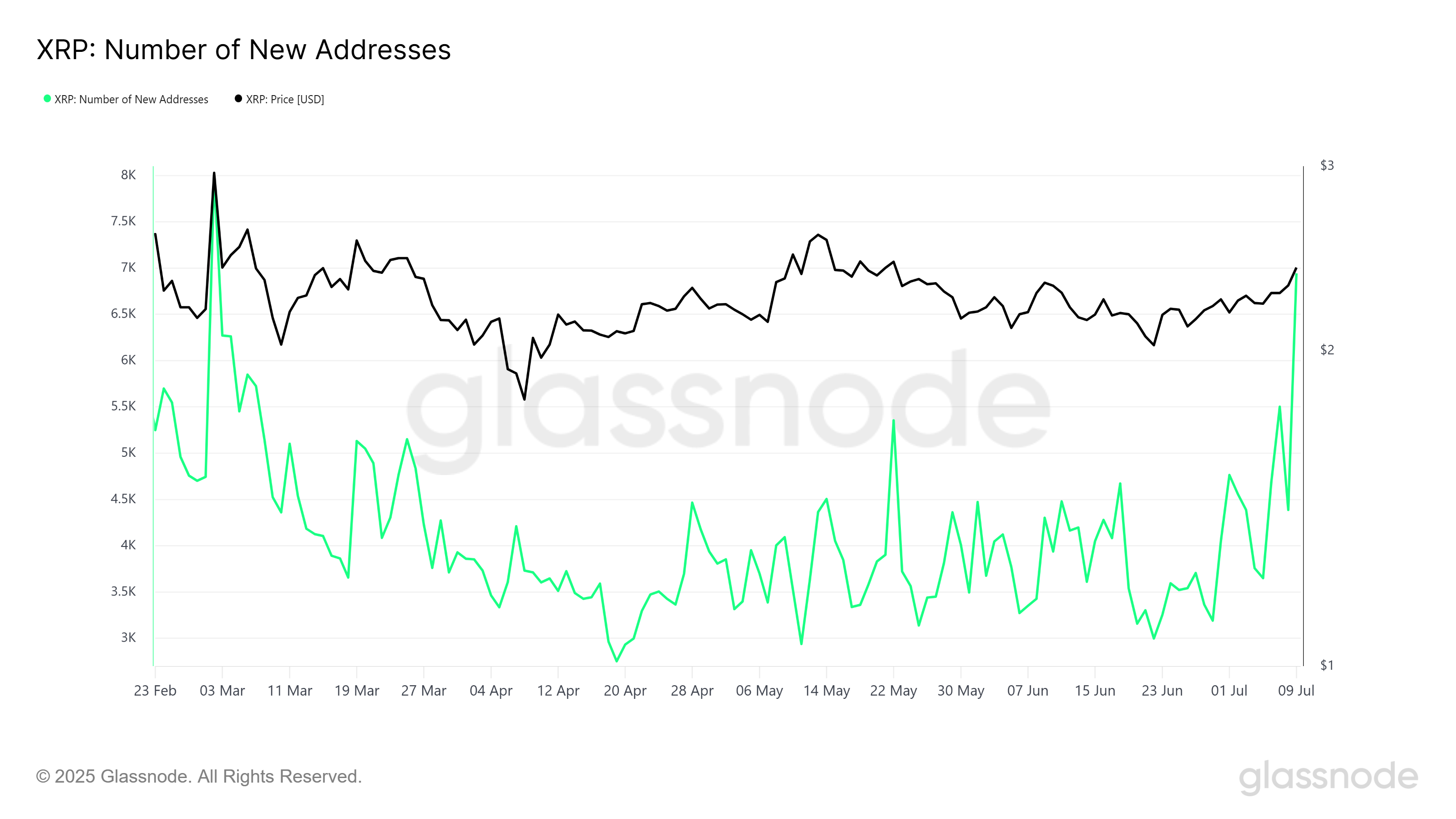Dalam beberapa hari terakhir, jumlah alamat baru XRP meningkat tajam, dengan hampir 7.000 alamat baru dibuat setiap hari. Lonjakan alamat baru ini adalah level tertinggi yang terlihat dalam empat bulan terakhir, menandakan bahwa XRP mendapatkan daya tarik signifikan di pasar.