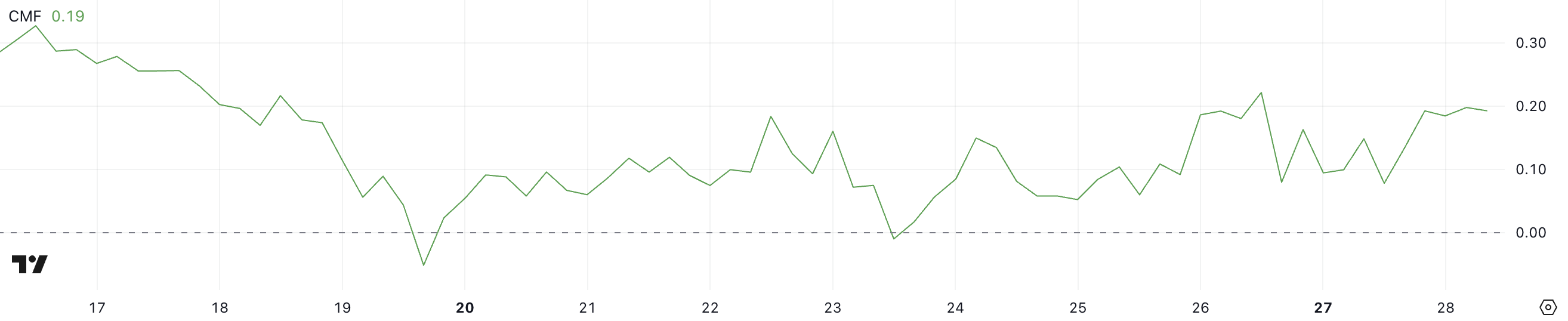 Chaikin Money Flow (CMF) XRP telah naik menjadi 0,19 dari 0,08 hanya sehari yang lalu, menunjukkan peningkatan arus modal masuk dan tekanan beli yang lebih kuat. Ini menunjukkan bahwa investor sedang mengakumulasi XRP, sebuah tanda potensial dari sentimen bullish yang berkembang di pasar.