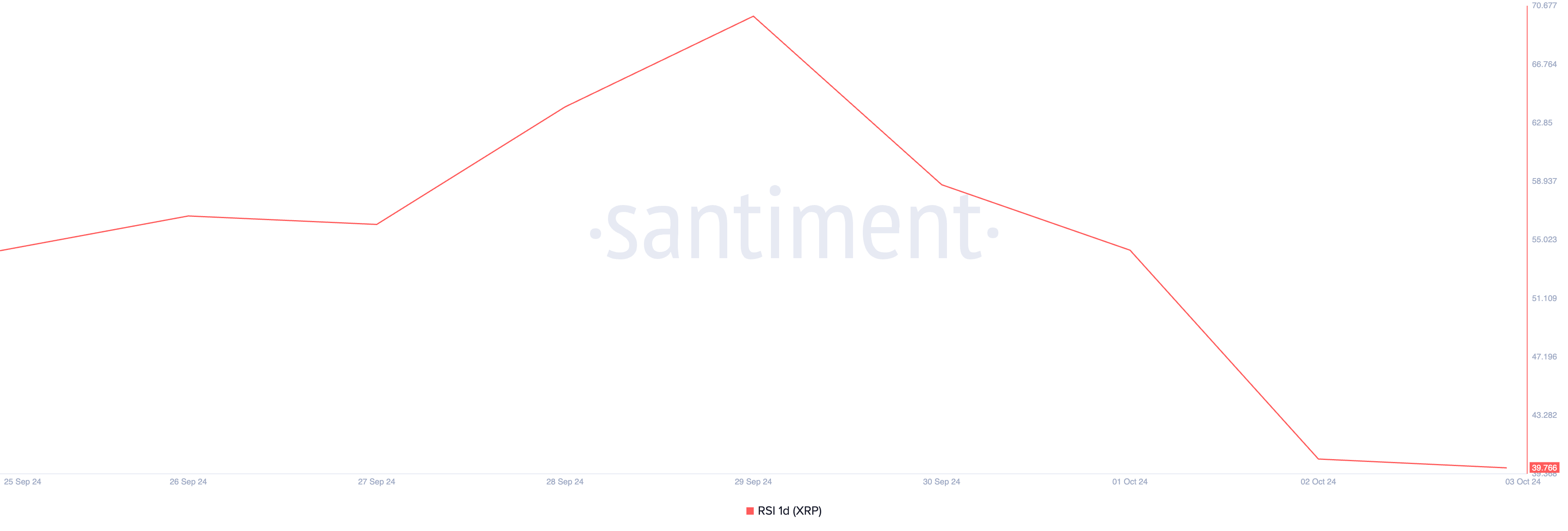 Lebih lanjut, penurunan Indeks Kekuatan Relatif (RSI) XRP mendukung pandangan bearish ini. Indikator ini mengukur kondisi pasar yang oversold dan overbought dan berkisar antara 0 hingga 100. Nilai di atas 70 menunjukkan bahwa aset terlalu banyak dibeli dan memerlukan koreksi, sementara nilai di bawah 30 menunjukkan bahwa aset terlalu banyak dijual dan mungkin akan mengalami rebound.