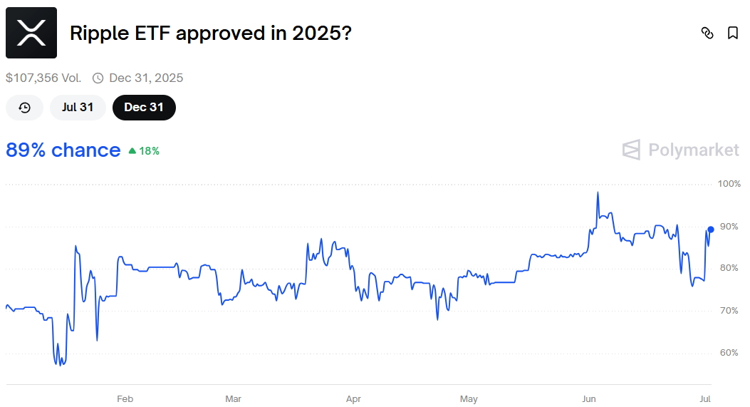 Peluang persetujuan untuk ETF XRP spot telah menarik perhatian, dengan peluang meningkat menjadi 89% di Polymarket. Para penggemar XRP menunjukkan permintaan institusional yang meningkat sebagai faktor kunci yang mendorong persetujuan akhirnya. Namun, meskipun banyak yang mengharapkan persetujuan pada akhir Juli, peluang di Polymarket baru-baru ini turun menjadi hanya 17%.