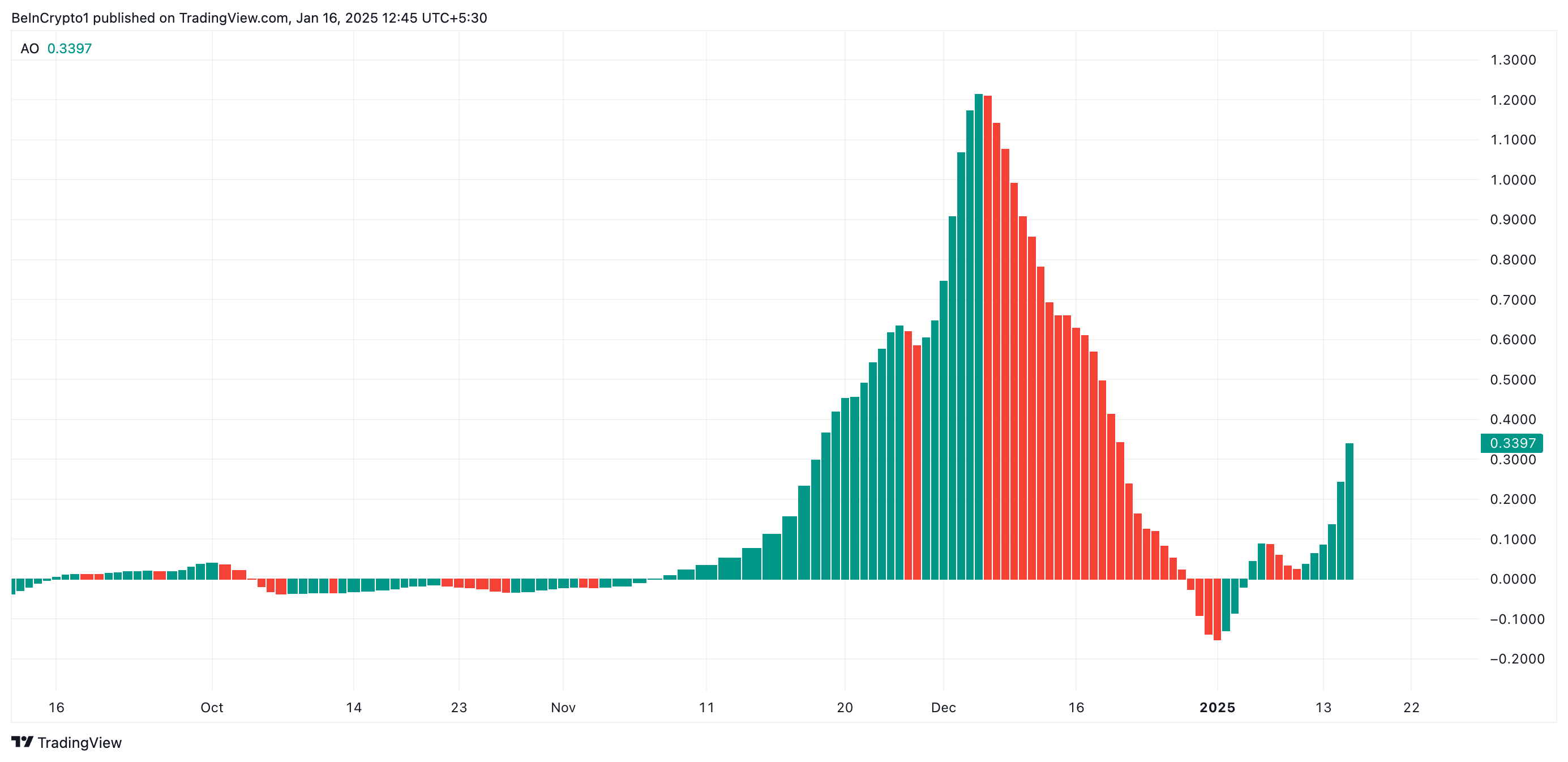 Awesome Oscillator XRP mencerminkan peningkatan akumulasi token. Pada saat penulisan, indikator ini menunjukkan batang histogram hijau yang menghadap ke atas, dengan nilainya pada 0,33.