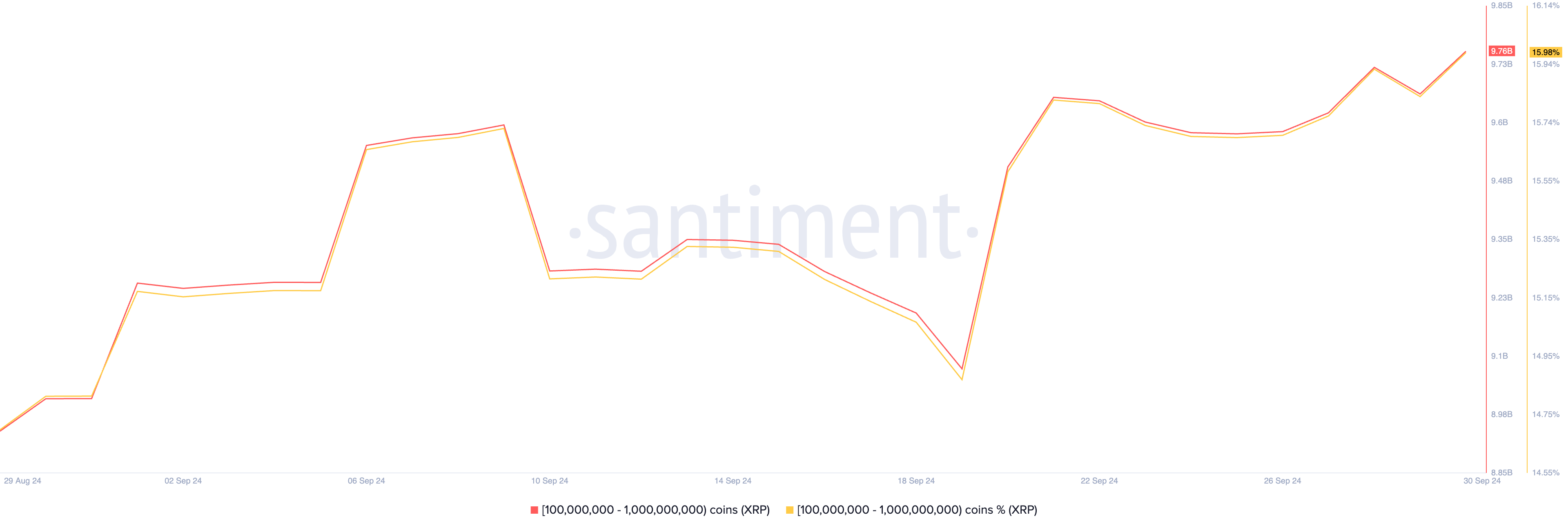 Di samping itu, akumulasi whale XRP yang terus meningkat kian memperkuat sentimen bullish. Holder dengan saldo antara 100 juta hingga 1 miliar XRP terekam menambah kepemilikan mereka sebanyak 680 juta XRP (setara US$435 juta lebih) dalam dua minggu terakhir.