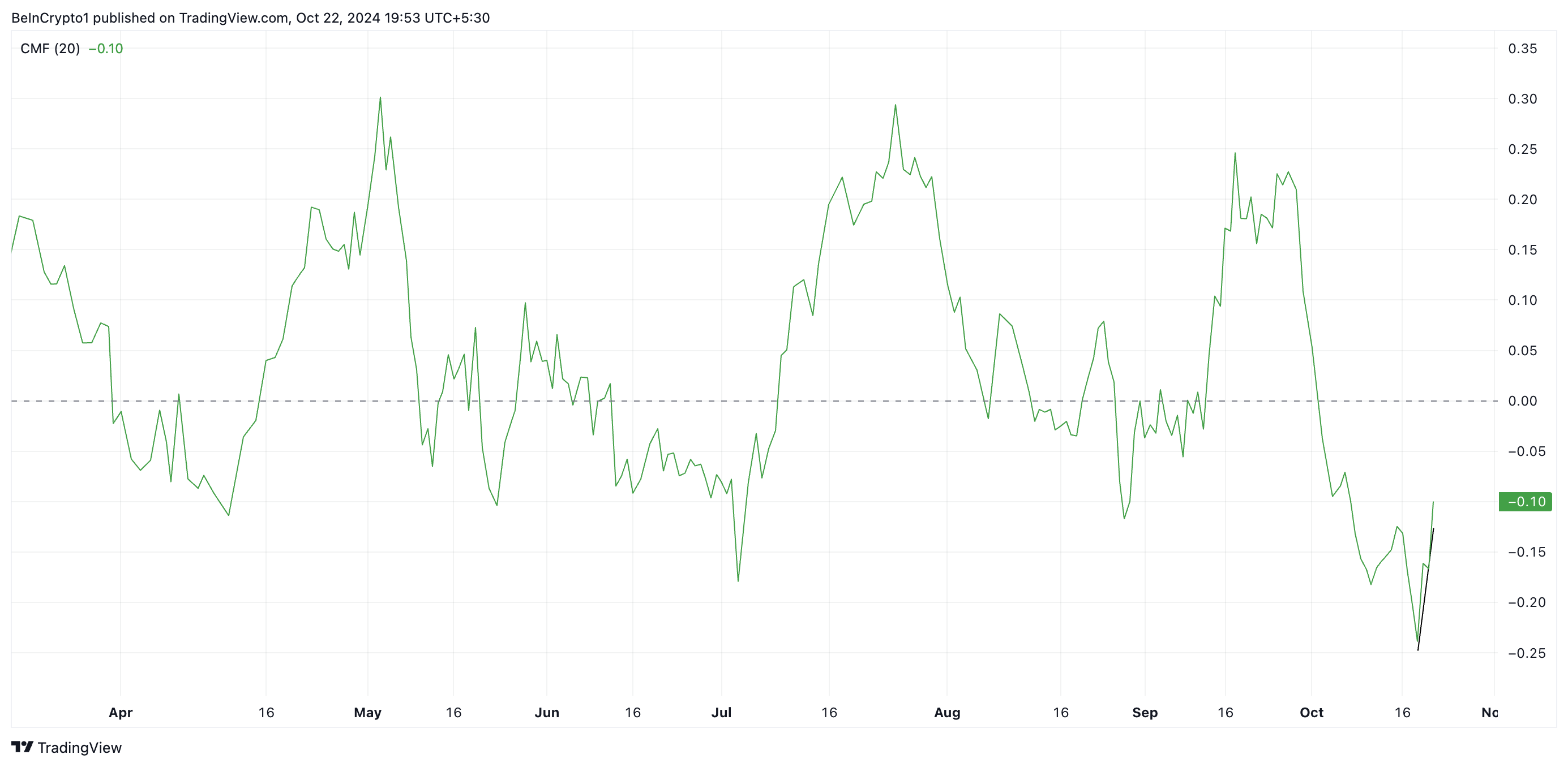 Meskipun harga XRP mengalami koreksi, Chaikin Money Flow (CMF) XRP terbukti masih betah dalam tren naik dalam beberapa hari terakhir. Indikator ini mengukur tekanan beli dan jual aset selama periode waktu tertentu. Saat ini, CMF berada di -0,10, mencoba menembus garis nol.