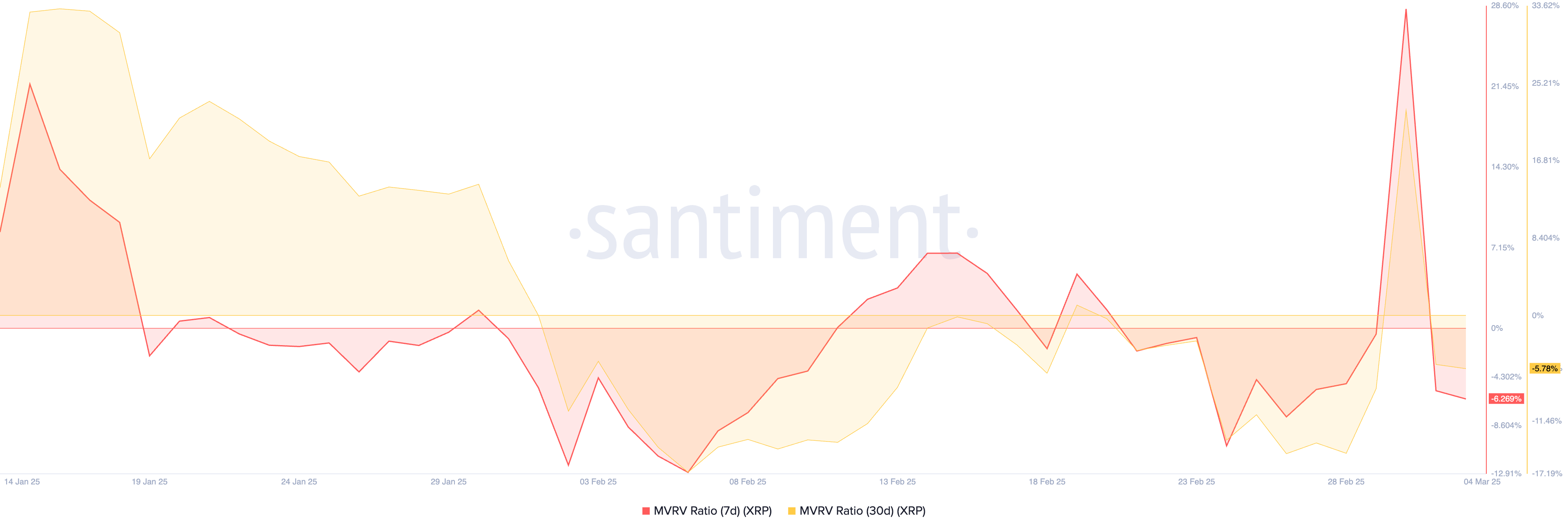 Rasio Market Value to Realized Value (MVRV) XRP yang diukur menggunakan beberapa moving average (MA) menunjukkan bahwa altcoin ini saat ini diperdagangkan di bawah nilai wajarnya (undervalued). Menurut data dari Santiment, pada waktu publikasi, rasio MVRV 7 hari dan 30 hari XRP masing-masing berada di -6,85% dan -6,36%.