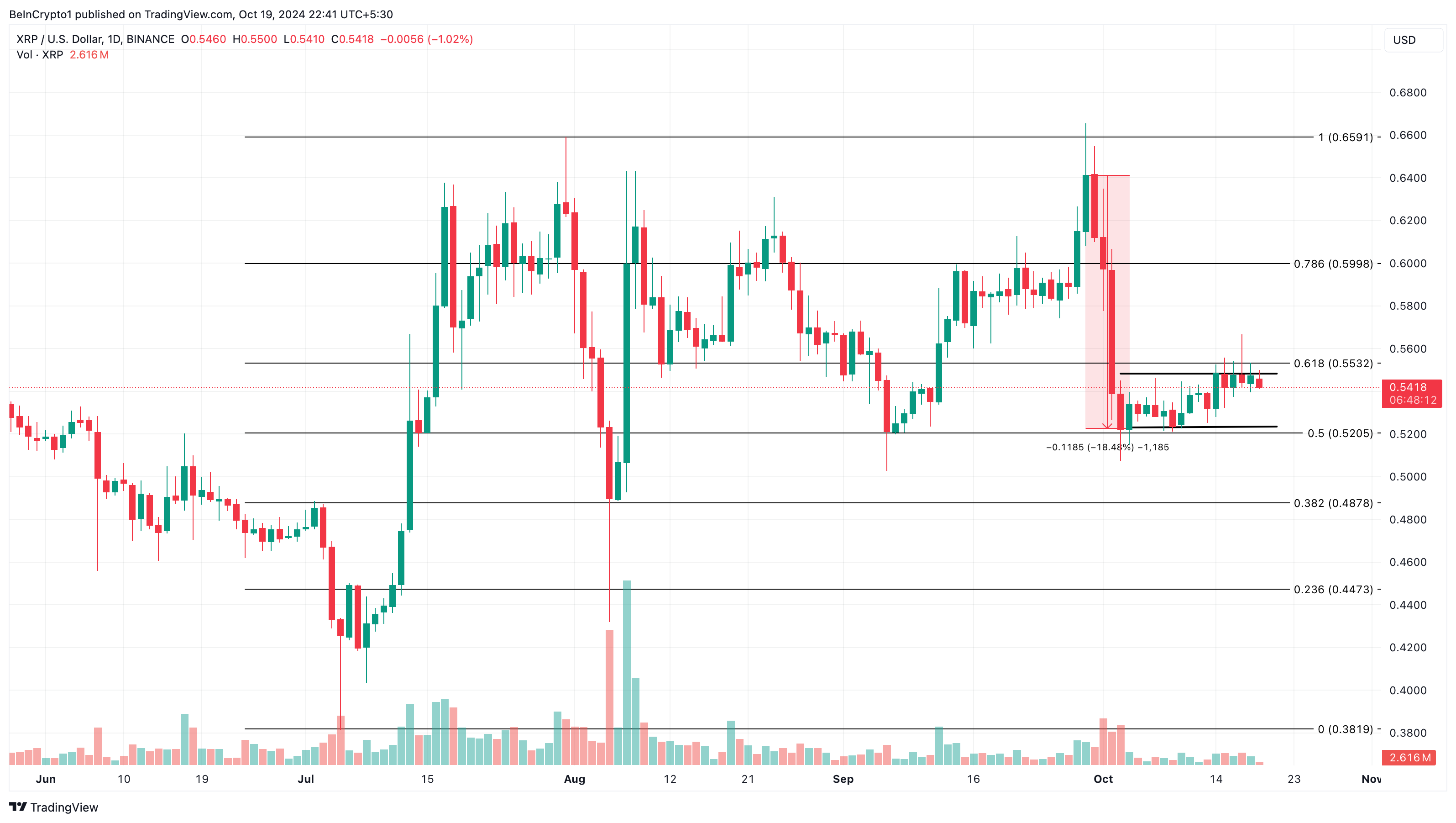 Awal bulan ini, harga Ripple (XRP) turun 18% dalam tiga hari. Sejak 3 Oktober, namun, token telah stabil, diperdagangkan antara US$0,52 dan US$0,55.