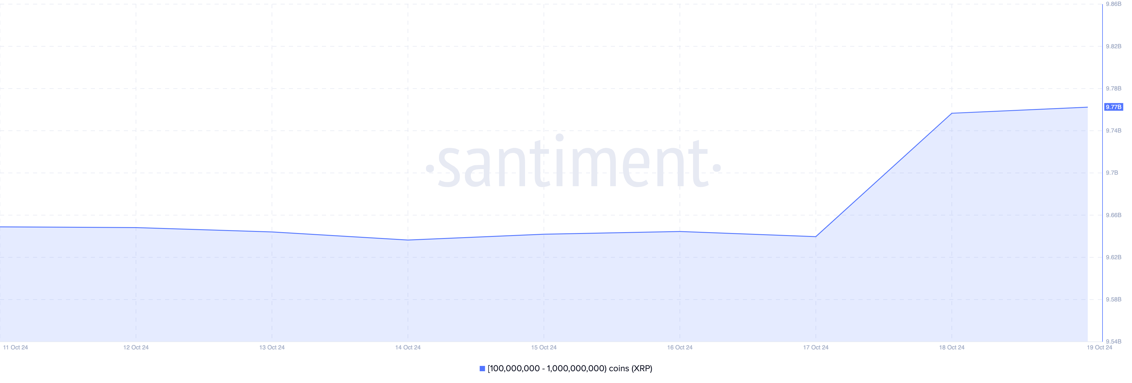 Menurut Santiment, alamat dengan kepemilikan antara 100 juta dan 1 miliar XRP memiliki 9,63 miliar token pada 17 Oktober. Jumlah tersebut telah meningkat menjadi 9,77 miliar, menunjukkan akumulasi sekitar 140 juta XRP, bernilai sekitar US$77 juta.