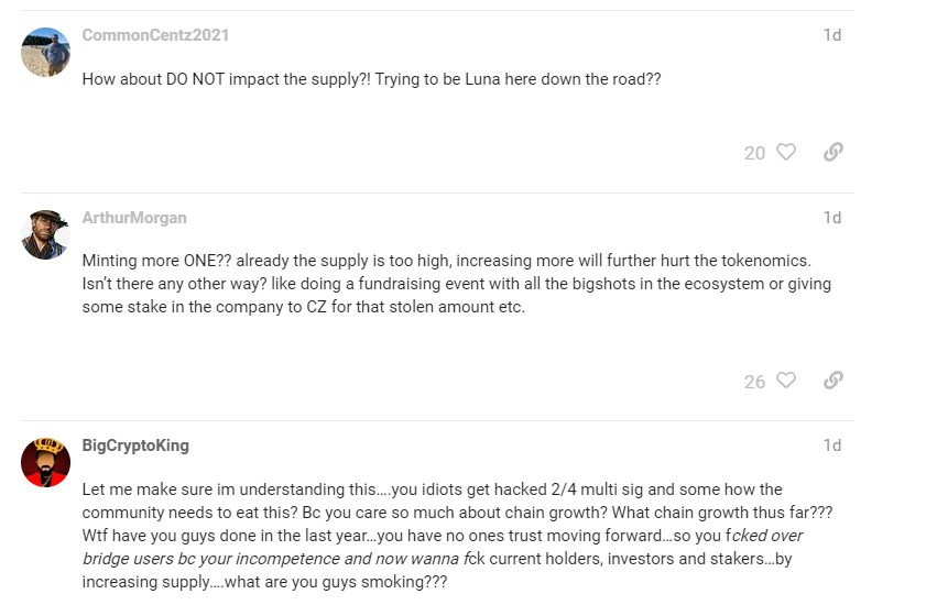 Namun, ternyata rencana yang hendak Harmony Protocol lakukan ini banyak mendapatkan penolakan dari para penggunanya. Beberapa pengguna beranggapan bahwa dengan mencetak lebih banyak token, tidak akan membuat harga ONE naik.