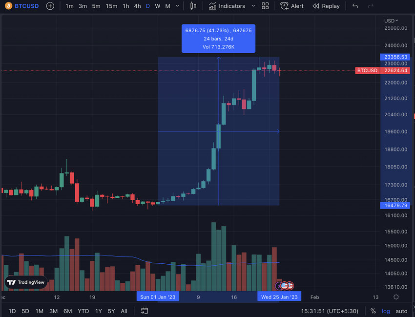 Menurut data dari TradingView, BTC mencapai titik terendah di tahun 2023 di sekitar level US$16.500 pada 1 Januari dan kemudian naik drastis ke level tertingginya tahun ini di harga US$23.300 pada 23 Januari.