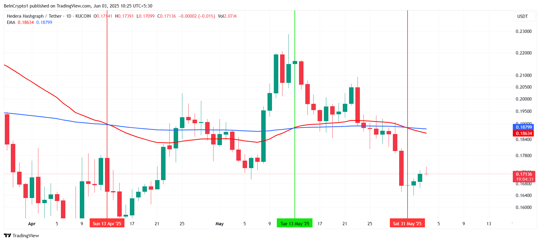 Indikator teknis paling mengkhawatirkan bagi para trader HBAR saat ini adalah pembentukan Death Cross, yang terjadi pada akhir Mei. Ini adalah kali kedua dalam enam minggu terakhir HBAR mengalami pola bearish ini. Death Cross terjadi ketika Exponential Moving Average (EMA) 200 hari melintasi di atas EMA 50 hari, menandakan potensi pergeseran ke arah bawah.