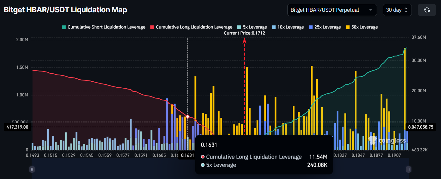 Peta likuidasi saat ini semakin menyoroti momentum makro HBAR, menunjukkan potensi risiko bagi para trader jika harga terus menurun. Jika HBAR jatuh di bawah support saat ini di US$0,163, ini bisa memicu likuidasi sebesar US$11,5 juta, semakin memperkuat momentum bearish.