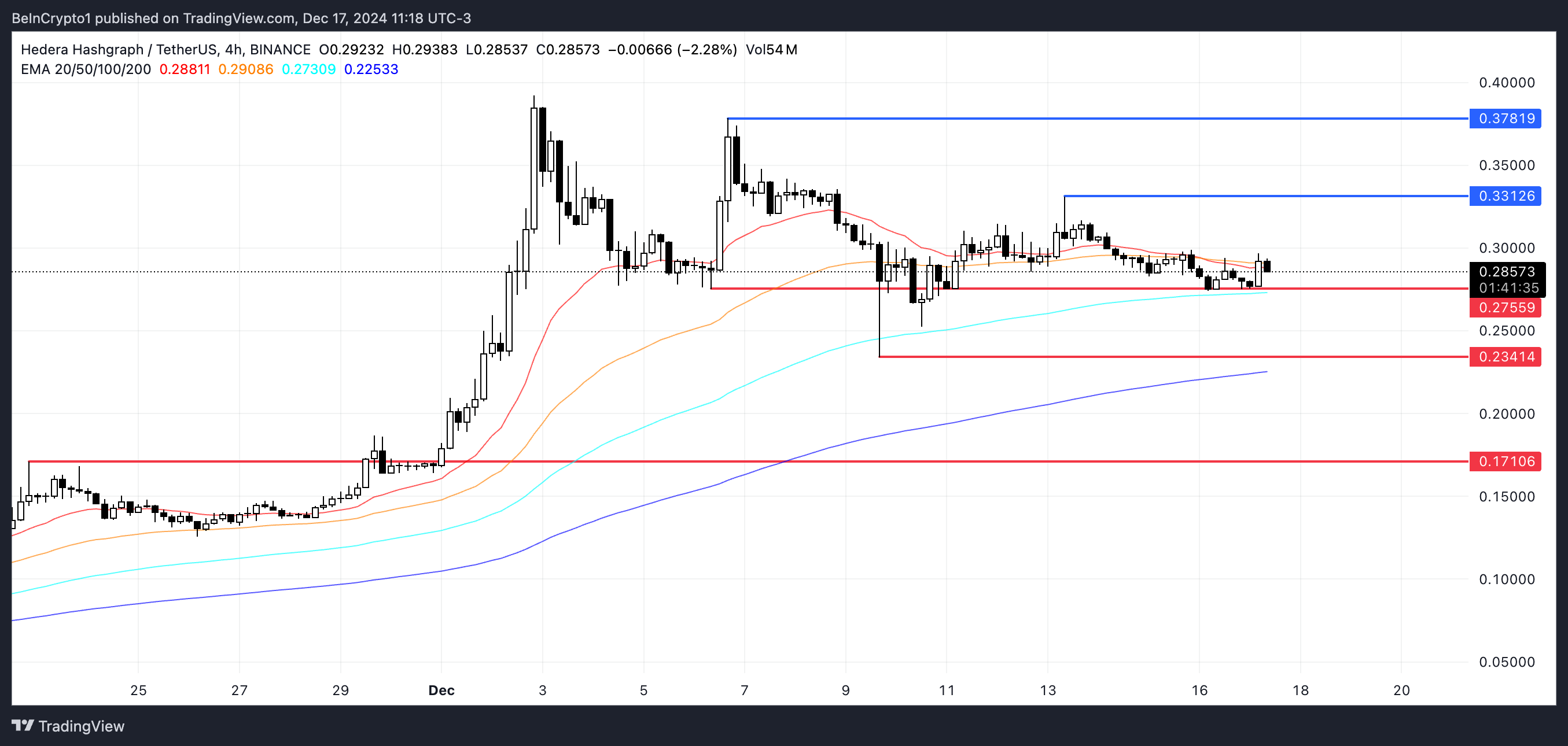 Kondisi saat ini dari garis EMA Hedera menunjukkan kehati-hatian, karena garis jangka terpendek telah mulai menurun dan sekarang sangat dekat dengan garis jangka panjang. Jika trajektori ini berlanjut dan menghasilkan death cross, ini bisa menandakan pergeseran bearish untuk aset tersebut. Formasi semacam itu kemungkinan akan menekan HBAR untuk mempertahankan level support US$0,275.