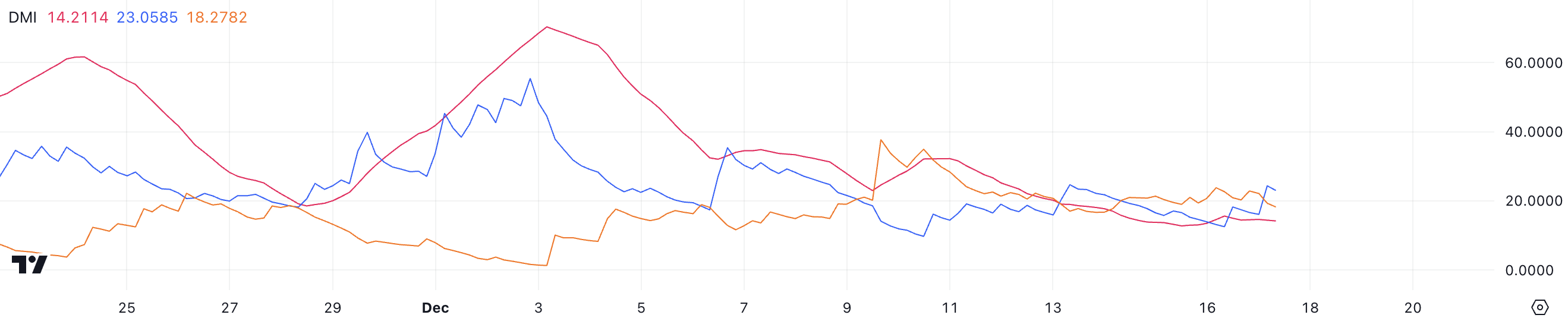 HBAR ADX telah turun dari puncaknya di 65 pada 3 Desember, ketika HBAR mencapai level tertinggi dalam 6 tahun, ke level saat ini di 14,2. ADX adalah indikator teknis yang mengukur kekuatan tren, dengan pembacaan di atas 25 menunjukkan tren yang kuat dan di bawah 20 menunjukkan tren yang lemah atau tidak ada.