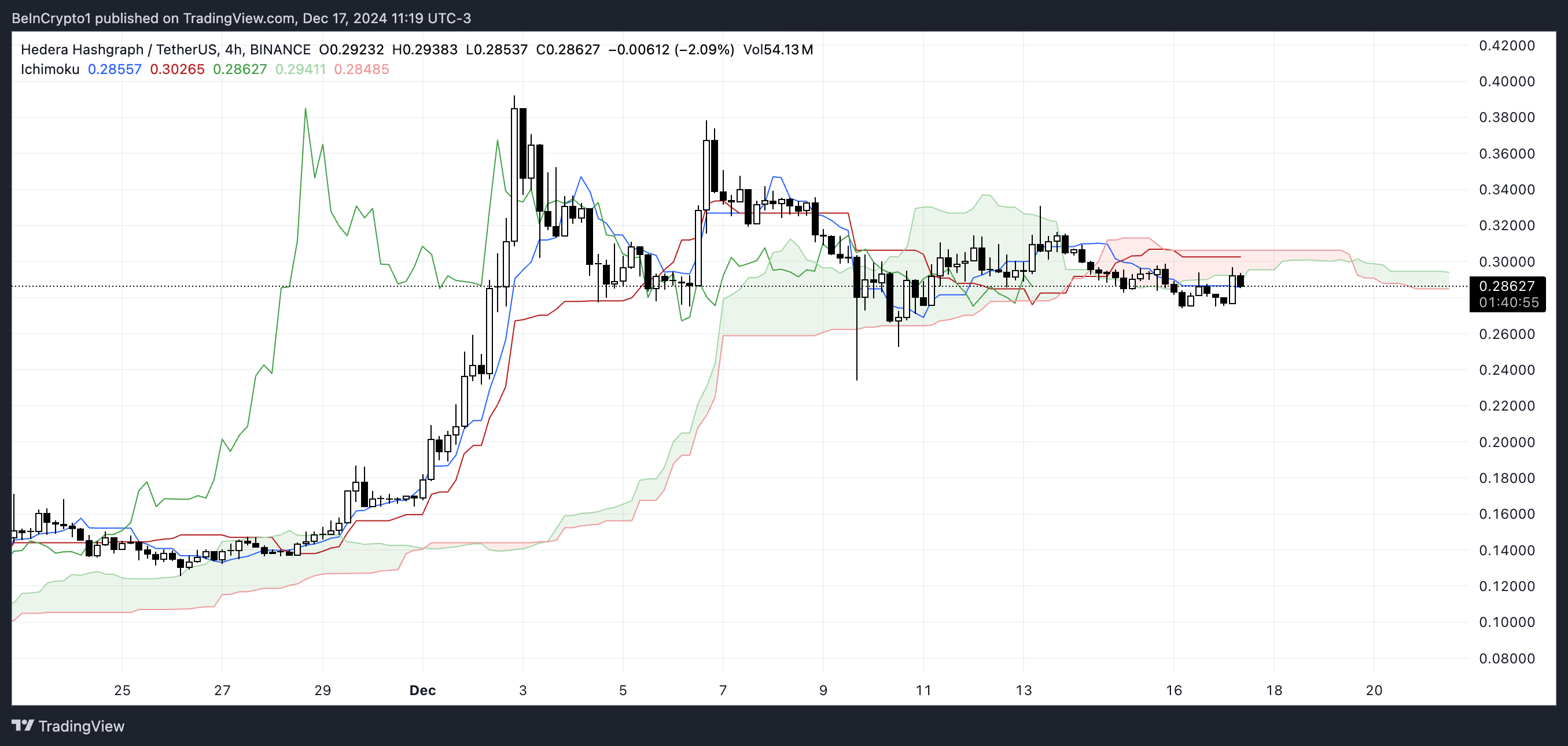Harga Hedera berada di bawah awan dan garis Ichimoku kunci, dengan beberapa lapisan resistance di atas. Awan itu sendiri menunjukkan ketebalan yang signifikan dan tetap di atas harga, menunjukkan resistance kuat di atas.