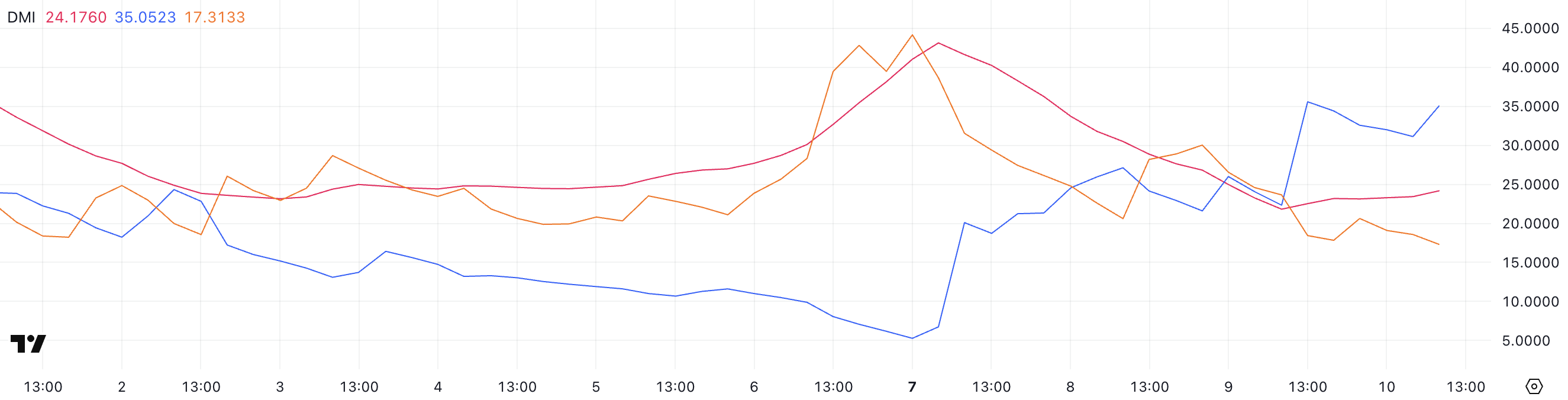 Grafik DMI Hedera menunjukkan tanda-tanda penguatan momentum tren, dengan ADX (Average Directional Index) naik ke 24,17 dari 21,82 hanya sehari yang lalu.
